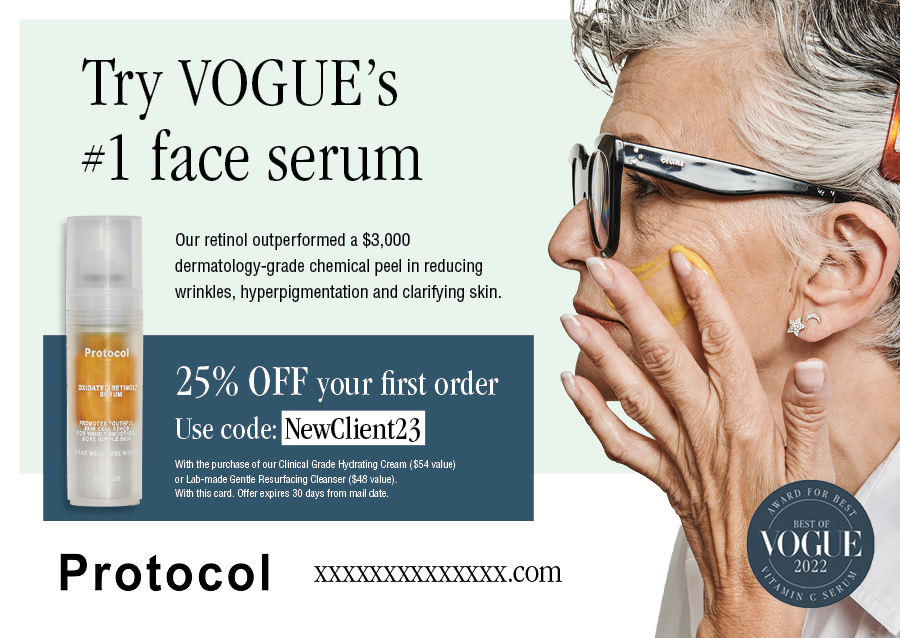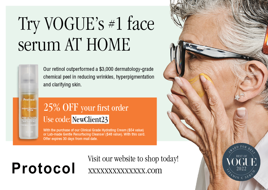 Without changing too much of the copy, there were a few things to be done to better suit the luxury feeling of this card. Opting for a more subtle dark blue over the abrasive orange in the offer space helps with hierarchy and flow between elements. Getting rid of the call to action above the website as well as a few words in the headline help the design breath now that there’s a bit more negative space. The product image is larger and more apparent now that the orange block is gone.